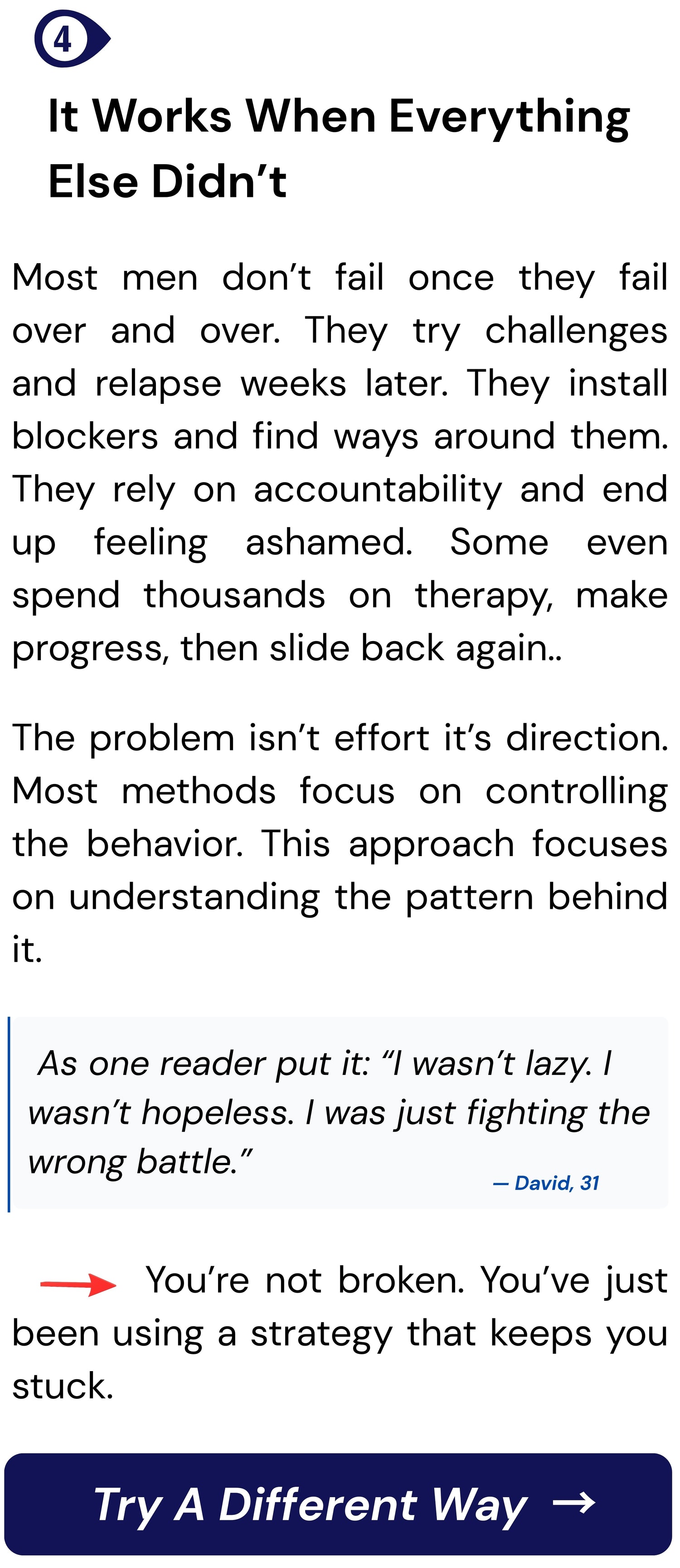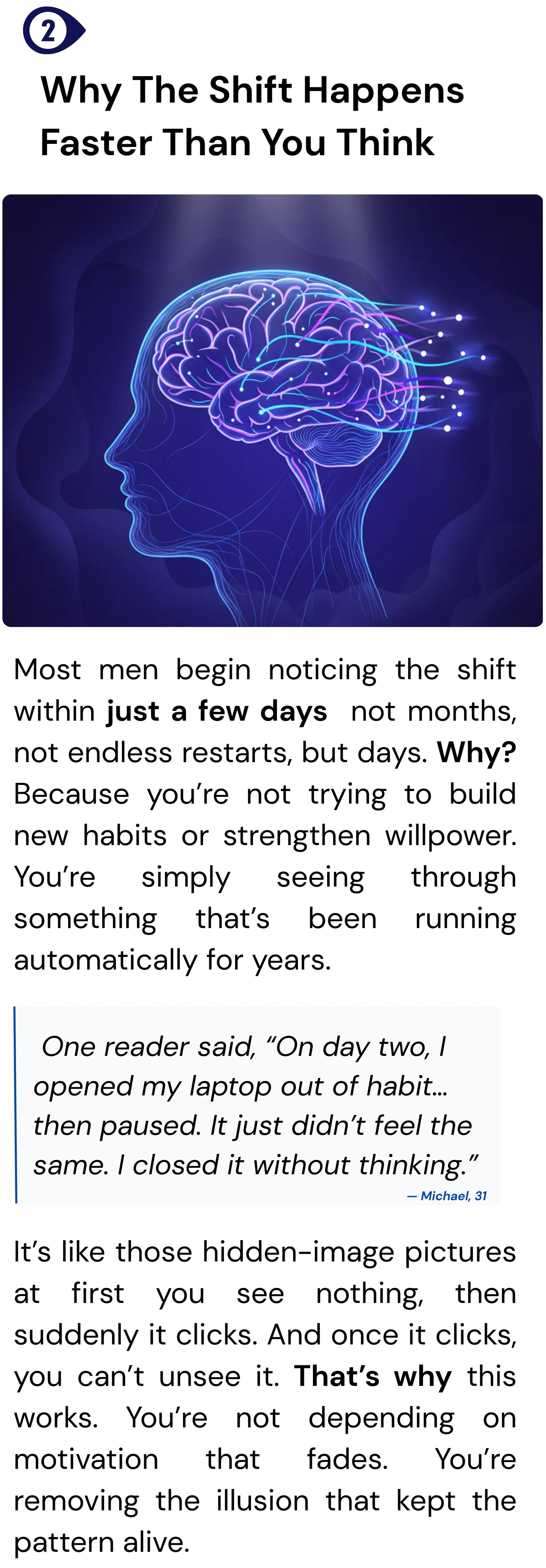 If you’ve tried quitting pornography already, you’ve probably tried ‘streak counting’ or going on a ‘porn diet’ (i.e using porn every three days or so) but The Silent Shift isn’t about that, and you’ll soon see why these willpower methods actually make quitting harder.